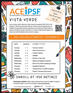 Have fun representing Vista Verde at this year’s Volley Fest Volleyball tournament for boys and girls in grades 5 to 8. The tournament will be held on October 25th and 26th at IUSD gyms. Register online now (insert link here ) . Last day to register is September 26th!