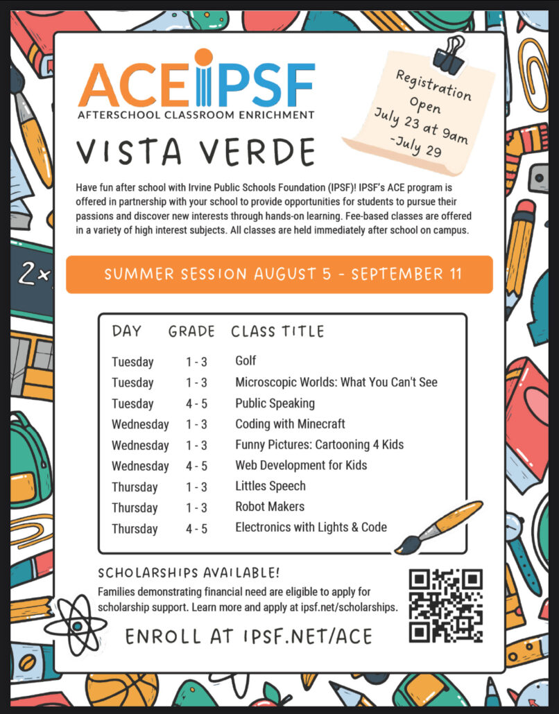Register for Afterschool Classes!Looking for activities to keep your child engaged and learning while having fun after the school day? The next session of IPSF’s ACE program is coming soon, offering our students hands-on opportunities to explore interests and discover new passions. Classes are held in-person, directly after school on our campus beginning August 5, 2025. For more information on classes offered, and to register, visit: https://ipsf.net/wp-content/uploads/ACE-Flyer-Vista-Verde.